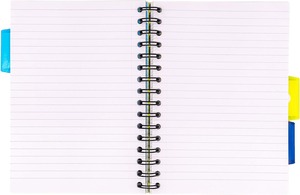 80 g-os magas minőségű fehér papír. Csíkos PP borító. Perforált vonalas lapok. Dupla spirálozás. Áthelyezhető 3 db műanyag elválasztókkal.