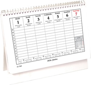 200x140 mm, 70 g-os ofszet, spirálozott lapok. Naptárrész: holdfázisok, magyar névnap és ünnepnap kiemelés, napkelte/napnyugta, hónap áttekintő, horoszkóp, 8 - 19 h. 54 lapos terjedelem.