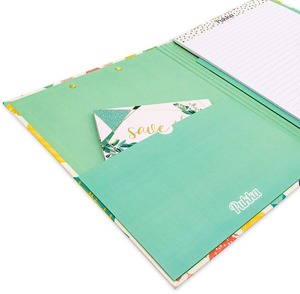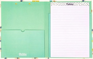 Karton bevonatú, mintás, fedeles felírótábla. Belül praktikus tárolózsebbel. Mintás fejben ragasztott jegyzettömbbel.