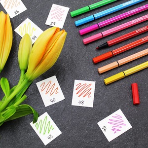 Műanyag filctest. A tinta színével megegyező színú kupak és test. Vízbázisú tinta. Lélegzőszeleppel ellátott kupak.