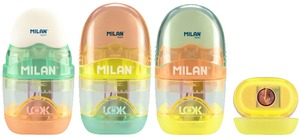 Modern design. 1 lyukú hegyező, normál méretű ceruzákhoz. Műanyag hegyezőtest. Beépített, cserélhető radírral. A hegyező rész kupakkal zárható.