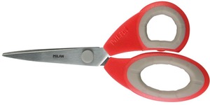 Kiváló minőségű irodai olló. Ergonómikus kialakítású, gumírozott fogórész. 19 cm.