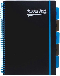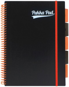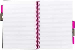 80 g-os, magas minőségű fehér papír. PP borító. Perforált és lyukasztott vonalas lapok. Dupla spirálozás. Áthelyezhető műanyag elválasztólapokkal (5 db). A gumi zárópánttal megegyező színű műanyag spirál.