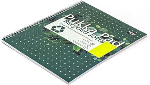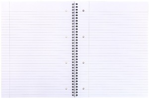 80 g-os környezetbarát újrahasznosított papír. Karton borító. Perforált és lyukasztott vonalas lapok. Dupla spirálozás.