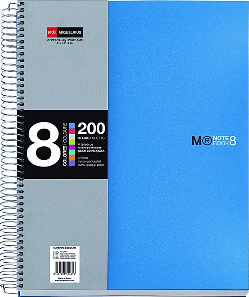 Színes PP borító. Mikroperforált és lyukasztott lapok. Nyolc színregiszter. 70 g-os ofszet nyomású beloldalak. Visszaforduló spirálozási technika.