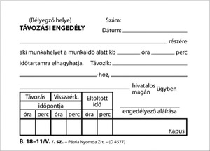 Távozási engedély B.18-11/V 105x74 mm 50x2 lapos Pátria