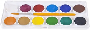 Élénk színű, műanyag tokos vízfesték. 24 mm-es átmérőjű korongok. Ajándék ecset.