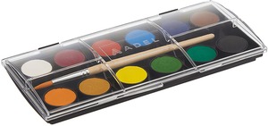 Élénk színű, műanyag tokos vízfesték. 24 mm-es átmérőjű korongok. Ajándék ecset.