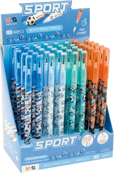 Mintás, műanyag ceruzatest, sportos (foci és kosárlabda) mintákkal, folyamatosan adogolható ceruzabetét.